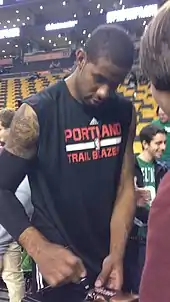 Despite trade rumors during the 2013 offseason, Aldridge voiced his desire to stay put in Portland, while also asking for improvements to the Blazers' roster.[21] Aldridge started out his eighth NBA season strong, recording five straight double-doubles from November 9 to 17. On November 23, 2013, in a game against the Warriors, Aldridge was involved in an altercation after Warriors center Andrew Bogut became entangled with Joel Freeland. On November 25, it was announced that he was fined $45,000 for escalating the incident.[22] The very same day, Aldridge was named Western Conference Player of the Week for the fourth time in his career. The award came in the midst of an 11-game win streak for the Blazers, during which Aldridge averaged 21.1 points, 11.3 rebounds, 2.5 assists, and 2.5 blocks per game. On December 12, 2013, Aldridge scored 31 points and grabbed a career-high 25 rebounds in a 111–104 victory over the Houston Rockets, becoming the first player in Portland Trail Blazers franchise history with at least 30 points and 25 rebounds in a game.[23] On January 23, 2014, Aldridge recorded a career-high 44 points along with 13 rebounds, 5 assists and 2 blocks in a 110–105 victory over the Denver Nuggets.[24]