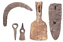 Cultivation was done with wooden ploughs reinforced with iron ploughshares, of which a number have been found in the houses of the town. Other agricultural tools found at the site include billhooks, sickles, hoes and rakes, forming one of the most complete tool assemblages known for pre-Roman agriculture in Spain.[21]