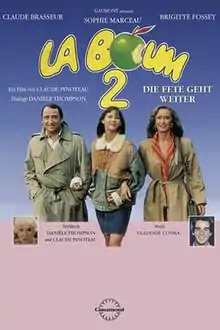 La Boum 2 is a 1982 French teen romantic comedy film directed by Claude Pinoteau and starring Claude Brasseur, Brigitte Fossey, and Sophie Marceau. Written by Danièle Thompson and Claude Pinoteau, the film is about a girl who falls in love with a boy and must deal with the question of making love for the first time. La Boum 2 is the sequel to 1980's La Boum (The Party). The music group Cook da Books became famous in many countries through their soundtrack song "Your Eyes".[2] Like its predecessor, La Boum 2 was a financial success, earning 4,071,600 admissions in France.[3] In 1983, the film received the César Award for Most Promising Actress (Sophie Marceau), and was nominated for Best Music (Vladimir Cosma) and Best Supporting Actress (Denise Grey).[4]