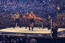 Meanwhile, Vickie was also using her power on SmackDown to help Edge retain his championship. When Edge was forced to defend his championship at the Royal Rumble, Vickie announced a Beat the Clock challenge, placing perennial rivals Batista and Undertaker in difficult matches, facing Hawkins and Ryder in a handicap match and having a special guest referee, respectively. However, Undertaker used his powers to turn the arena lights out and attack Edge, which helped Rey Mysterio to become the contender.[11] At the event, Edge came to the ring with his entourage, aside from Chavo, who was participating in the event later that evening. Hawkins and Ryder were sent from ring side early during the match and Mysterio almost beat Edge after using his 619 finishing move, but as the referee tried to count for three, Vickie rose up from her chair and pulled the official from the ring. As Mysterio reprimanded Vickie, Edge tried to run into him, but ended up on the ropes, once again allowing Mysterio to attempt another 619; however, this time Vickie jumped on the ropes and hugged Edge, protecting him from the move and giving Edge enough time to recover and use his spear to pin Mysterio and win the match.[15] On the Valentine's Day episode of SmackDown, the week before the No Way Out pay-per-view, with Vickie back in her wheelchair as a result of Mysterio's 619, Edge proposed to Vickie. After she accepted, Mysterio came to the ring and voiced his disappointment at the union and proceeded to come at Edge with a springboard senton, but as he ducked, Mysterio hit Vickie instead.[16] At No Way Out, Edge retained the championship over Mysterio again to end their rivalry, while Chavo successfully defended his championship against Punk.[17] However, The Undertaker also became the new contender for Edge's championship at the pay-per-view,[17] and La Familia began to target him, with Edge, Hawkins, and Ryder defeating The Undertaker in a handicap match on SmackDown in March.[18] The entire group (aside from Vickie) also took on Ric Flair and Shawn Michaels in a steel cage match, but The Undertaker invaded the cage using his powers, attacking the group as Edge climbed over the cage in fear to win the match for the team.[19]