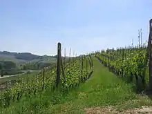 Located among the Langhe hills, the Barolo zone is a collection of different mesoclimate, soil types, altitudes and expositions that can have a pronounced effect on the development of the nebbiolo grape and the resulting Barolo wine.[11] Within the Barolo zone there are two major soil types separated by the Alba-Barolo road. Within the communes of Serralunga d'Alba and Monforte d'Alba is a compact, sandstone-based soil dating from the Helvetian epoch. In the Barolo and La Morra zone, the soils are similar to those found in the Barbaresco zone, dating from the Tortonian period, being composed of calcareous marl that is more compact and fertile.[3] Throughout the Barolo zone there are clay deposits and soil with enough alkalinity to tame nebbiolo's naturally high acidity.[7] In Jan 2007 Filippo Bartolotta indicated how a vertical tasting of Barolo, from 1985 to the present "showcased Barolo's longevity, intense aromatics, freshness, silk-and-cashmere tannins and also highlighted the considerable contrast between production zones".[12]