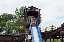The Montreal region park is located within the St Lawrence river on Saint Helen's Island, situated atop a man-made extension on its northern tip where the small (water-enclosed) Ronde Island had once been. The former granite Ronde island, which the extension was made around, was destroyed by blasting and the resulting crater it left turned into Dolphin lake, which the park surrounds.[2][3] South of the amusement park is Jean-Drapeau Park, an urban park and former grounds of Expo 67, as well as the Jean-Drapeau Metro station and Montreal Biosphere museum.