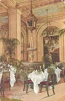Considered by some to be Chicago's most beautiful hotel dining room,[24] the Palm Room featured an Italian fountain after a model by Donatello as its centerpiece.[20] It was built of cream-colored stone, Rookwood tile, and gray terra cotta,[24] while featuring high-beamed ceilings.