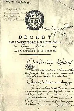 La Patrie en danger (French: "The country (fatherland) in danger") was the start of a declaration by the French Assembly on 11 July 1792 in response to Prussia joining Austria against France. Along with the Levée en masse declared the next year, it was part of the growing idea of "people's war" which developed during the French Revolution, where ideology "not only conscripted manpower for the regular armies but also inspired ordinary people to fight on their own account."[1]