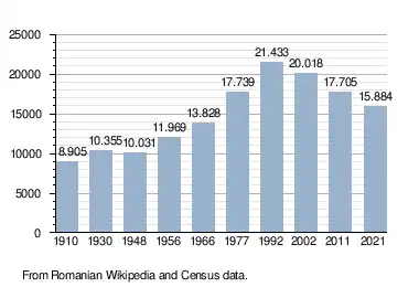 At the 2021 census, Gheorgheni had a population of 15,884.[3] At the 2011 census, the city had a population of 17,705, of which 86.13% (15,250) were Hungarians and 1,988 (11.22%) Romanians.