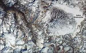 Laguna del Diamante (Spanish for "lake of the diamond") is a lake located in the province of Mendoza, Argentina, in the San Carlos Department, some 198 km from Mendoza. It covers a surface area of about 14.1 km2 and is one of the largest freshwater resources in the Province. Nearby is Maipo volcano. The volcano and its reflection in the lake forms diamond-shape image, which gives the lake its name. It is known for its stunning beauty. However, few get the chance to see it because it is passable only in February and only via an off-road vehicle.