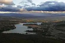 In 1911, a competition for the design of Canberra was launched, and Scrivener's detailed survey of the area was supplied to the competing architects.[3] The Molonglo River flowed through the site, which was a flood plain[5] and Scrivener's survey showed in grey an area clearly representing an artificial lake—similar to the lake later created—and four possible locations for a dam to create it.[6][7] Most of the proposals took the hint and included artificial bodies of water.[3]