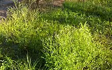 There are large areas of samphires (Halosarcia spp.) in broad margins across the lake bed and on islands.[6][18] Samphires are succulent, perennial erect or spreading shrubs to one metre tall, often growing in waterlogged and saline areas. They belong on the Chenopod family so are related to saltbushes and bluebushes. Stems and branches are green to reddish-purple, and made up of numerous articulated segments. They do not have obvious leaves; flowers are minute and grow in rows at the base of the fruiting segments.[19]