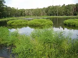 ![]() Lake Leon at Tom Brown Park in Tallahassee, Florida in the late summer of 2011, view toward the West. Several floating islands can be seen made of foam mats to provide a substrate for aquatic plants. | |