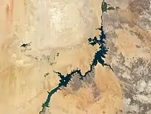 Lake Nasser (Arabic: بحيرة ناصر Boħēret Nāṣer, Egyptian Arabic: [boˈħeːɾet ˈnɑːsˤeɾ]) is a vast reservoir in southern Egypt and northern Sudan. It is one of the largest man-made lakes in the world.[2] Before construction, Sudan was against the building of Lake Nasser, because it would encroach on land in the northern part of the country, where many Nubian people lived who would have to be resettled.[3][4] In the end Sudan's land near the area of Lake Nasser was mostly flooded by the lake.[5]