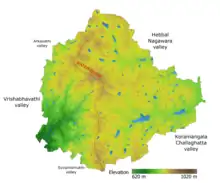 The topographic setting of the city has radial slopes towards east and west with a smooth ridge running north to south; rainfall over the ridge area gets divided and flows east or west into the three gentle slopes and valleys of Koramangala–Challagatta, Hebbal and Vrishabavathi. The average elevation is roughly 900 m (2,952.8 ft). These naturally undulating terrain of hills and valleys lends itself to the development of tanks that can capture and store rainwater. Small streams are formed by each valley starting with the ridge at the top. A series of shallow tanks varying in size are developed by the construction of bunds.[65][66] A tank generally consists of a shallow inflow area and a relatively deeper outflow area where the bund is.[67] The tank can further be zoned into a flooded area and a waterlogged zone.[68] Monsoons recharge the tanks and the outflow can be regulated for irrigation of monsoon crops during the last six months of the year. Most tanks are dry a couple of months before the onset of the new monsoon. A second crop can be considered on the basis of water levels. Other seasonal changes affect the water level. Urban sewage inflow allows some lakes to retain their water spread for a longer period.[69] Initially serving as a water source, these tanks over time also developed features of closed water lentic ecosystem habitats.[70] The catchments on the east and west of the ridge belong to the Ponnaiyar River and Arkavathi River respectively. Both these rivers flow into the Kaveri.[71]