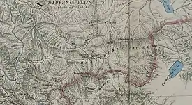 The Changchenmo Valley depicted by Frederic Drew, 1875. Lanak Pass labelled as simply "Pass" at the eastern end of the valley, through which the border passed.[1]