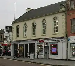 The present structure was designed in the neoclassical style, built in brick with a stucco finish and was completed in 1778.[10] The design involved a symmetrical main frontage of five bays facing north onto the High Street. There were shop fronts on the ground floor and round headed windows with architraves, imposts and keystones on the first floor, and there were rusticated quoins at the corners. The east end, which was fenestrated with sash windows on the ground floor and round headed windows on the first floor, featured a blind oculus in the gable above. There was a carving of a double headed eagle in the recess between the windows, recalling the double headed eagle in the Lanark coat of arms.[11]