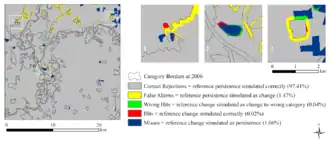 There are two types of validation in land change modeling: process validation and pattern validation. Process Validation compares the match between “the process in the model and the process operating in the real world”. Process validation is most commonly used in agent-based modeling whereby the modeler is using the behaviors and decisions to inform the process determining land change in the model. Pattern validation compares model outputs (ie. predicted change) and observed outputs (ie. reference change).[2] Three map analyses are a commonly used method for pattern validation in which three maps, a reference map at time 1, a reference map at time 2, and a simulated map of time 2, are compared. This generates a cross-comparison of the three maps where the pixels are classified as one of these five categories: