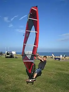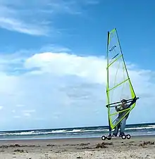 Land windsurfing, also known as “Terrasailing”, “street sailing”, “land sailing” and “dirt windsurfing”, is a sport similar to traditional windsurfing that is performed on land rather than water. A four wheeled deck, similar to a mountain board or skateboard deck, is commonly used in conjunction with a mast and sail in order to project the board across land.