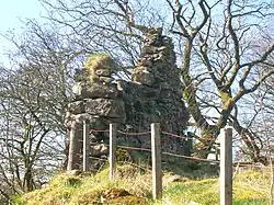 The Cuff Hill rocking stone (NS 3827 5542) is a large glacial erratic boulder of basaltic greenstone[30] that some people associate with the Druids. It no longer rocks due to people digging beneath to ascertain its fulcrum.[31] It is in a small wood and surrounded by a circular drystone wall.