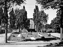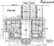 The first station building, which was south of the current location, was built before the opening of the railway in 1890. The construction of the railway to Celle brought changes. Already in 1914, planning had started on a new entrance building further north, as the railway line was to be raised by a few metres above ground level.[5] The construction did not begin until 1920 and it was completed in 1921.The entrance building was built in the North German clinker style (Norddeutschen Klinkerarchitektur) with influences of German reform style (Reformstil). The architecture is based on the original drawings of Ernst Moeller and Alexander Behnes. The building originally contained the station services, Langenhagen's Bahnmeisterei (the office of the head of track maintenance) as well as some waiting rooms. However, since the line to Celle was not yet in operation, it was designed to be used differently. The waiting room for the third and fourth class and later the entrance hall were temporarily used by Langenhagen's Roman Catholic parish for worship. It became a junction station on 15 May 1938 with the start of operations on the Langenhagen–Celle railway. A siding was built to Hannover Airport for freight traffic. As part of the S-Bahn construction, the track was upgraded and the platform for trains towards Celle were closed and the entrances were walled off. With the commissioning of the S-Bahn network on 28 May 2000, all stops for trains to Celle and for all other regional trains were transferred to Langenhagen Mitte station. At the same time, the station, previously simply referred to as Langenhagen was renamed Langenhagen Pferdemarkt (horse market). Both the entrance building and the access to the platforms were redeveloped using funds for the upgrade of the S-Bahn.[6][5] In the new millennium, the now listed station building was embossed on a commemorative coin entitled 700 Jahre Langenhagen (700 years of Langenhagen). In September 2013, it was sold by Deutsche Bahn’s subsidiary, Main Asset Management GmbH, to a private investor under an agreement preserving access to the platforms. Since 2014, comprehensive preservation work has been carried out and access to the station building's wings has been restored. Since the opening of the line, the station has provided a significant economic boost for the town.[7]