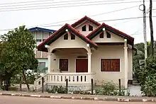 Lao Loum houses are built on wooden piles with the floor from one to two-and one-half meters above the ground. This style keeps the living area above the mud of the rainy season, provides a shady area under the house to work or rest during the day, and allows the house to catch breezes for natural cooling. Depending on the wealth and resources of the family, the walls and floor may be made of woven split bamboo or sawn wood; the roof is constructed from grass thatch, bamboo, wood shingles, or corrugated steel roofing sheet. Some older houses in well-off villages are roofed with clay tiles, but this style was no longer common in the early 1990s. A separate rice granary is built in the house compound, also on posts using similar construction. Livestock is sometimes kept under the house.[2]