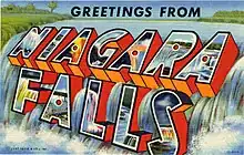 Large-letter postcards were a style of postcards popular in North America in the first half of the 20th century, especially the 1930s through the 1950s. The cards are so-called because the name of a tourist destination was printed in three-dimensional block letters, each of which were inset with images of local landmarks.[1] Sometimes called big-letter postcards, many featured the stock phrase "Greetings from..." which was derived from cards in Germany that read Gruss Aus.[2]