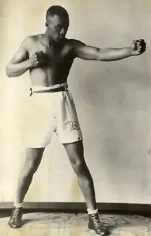 Gains was considered one of the top heavyweights of his era, but was denied the opportunity to fight for the British Championship and the World Championship due to the rules against black boxers competing for the titles, instead competing for the 'Coloured Heavyweight Championship of the World', a title that he won in 1928 and 1935.[8][19][20] His income from boxing dwindled after 1934 and in 1937 he was declared bankrupt.[21] In December 1938 he defeated Welsh champion George James on points.[22] In 1939, with the advent of World War II, Gains joined the British Army as a physical training instructor.[9] He served as a sergeant major in the Pioneer Corps in the Middle East.[23] His last fight was a defeat to Jack London in June 1942, held to raise funds for the RAF Benevolent Fund.[24]