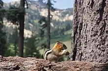 A golden-mantled ground squirrel eating foraged food near the southern entrance