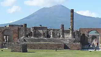 Late Visitors to Pompeii shows a scene from the ruins of Pompeii, the Roman city that was destroyed in the eruption of Mount Vesuvius in 79 AD and excavated in modern times. The location is the city's forum, surrounded by ruins and columns, facing the Temple of Jupiter. Behind the temple is a hilly landscape and at its centre Mount Vesuvius from which a smoke pillar emerges.[2]