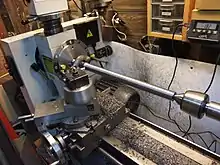 A revolving center, also known as a rotating center or running center in some countries, is constructed so that the 60° center runs in its own bearings and is used at the non-driven or tailstock end of a machine.[2] It allows higher turning speeds without the need for separate lubrication, and also greater clamping pressures. CNC lathes use this type of center almost exclusively and they may be used for general machining operations as well. Spring-loaded centers are designed to compensate for center variations, without damage to the work piece or center tip. This assures the operator of uniform constant tension while machining. Some live centers also have interchangeable shafts. This is valuable when situations require a design other than a 60° male tip. A live center, which may be hard or soft, is a plain center placed in the revolving mandrel; it moves and is therefore live.