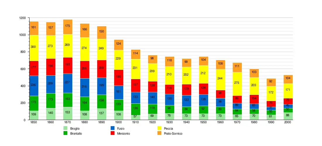 Broglio is first mentioned in 1361 as Brono.[4] Brontallo is first mentioned in 1574 as Bruntalo.[5] Fusio is first mentioned in 1258 as Fuxio.[6] Menzonio is first mentioned in 1364 as Menzone.[7] Peccia is first mentioned in 1374 as Petia.[8] Prato and Sornico were first mentioned in 1374.[9]