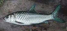The top sportfish caught in the rivers here is a large, green fish locally known as mpifu (or ntifu?), this is a type of yellowfish only found regionally.[3][7] In 2011 this was first identified as a species similar to Labeobarbus trachypterus,[8] it may be L. stappersi.[10] It is found in forested, rocky areas in the fast-flowing main channel and rapids of the Lukulu river.[8] Other sportfish are breams such as a large nembwe-like Serranochromis (locally known as nsuku?) and redbreast kurper (Tilapia rendalli), which are found in the same river habitat as the above yellowfish, and thinface largemouth (Serranochromis angusticeps) which is found in woodland streams.[3][8][10] Other breams found in these streams are S. thumbergi, vlei kurper or banded bream (Tilapia sparrmanii),[8] and three spot bream (Oreochromis andersonii).[3]