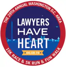 Lawyers Have Heart 10K Race, 5K Run and Fun Walk is an annual event that raises money for the research and community education programs of the greater Washington D.C. region affiliate of the American Heart Association (AHA). The event brings together law firms, in house counsel, government attorneys, legal vendors, residents, parents, children and athletes of all levels of experience, to raise awareness and public consciousness regarding heart disease and stroke. Since its inception in 1991, Lawyers Have Heart has raised over $13 million to benefit the AHA and further its mission to be a relentless force for a world of longer, healthier lives.[1] LHH is now one of the largest annual philanthropic endeavors supported by the greater DC legal community and has grown to become the area's largest 10K race.[1] The event has a fundraising goal of $1.5 million for the 2023 event taking place on Saturday, May 20th at 8:00 AM in Washington, D.C.[2]