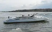 A layout boat is a low-profile un-motorized oval-like boat that is used by diver duck hunters to hide in when hunting in open water. They are unique to a specialized form of waterfowl hunting called Layout hunting. Most layout boats are used for diver duck or ocean duck hunting where open deep water waterfowl species frequent. Sometimes they are deployed in marshes for more traditional puddle duck hunting or goose hunting. Layout boats come in designs such as pumpkin seed, oval, and box like just to name a few. They come in one- and two-man models. These boats are painted to match the color of the water and sit very low in the water. The main focus of the layout boat is to put the hunter very close to the decoys if not in them for additional concealment. This makes for very dramatic hunting scenarios where a decoying bird comes extremely close to the hunter and boat. They are used to target diver ducks such as bluebills (greater scaup), canvasback, goldeneye, scoters and eider to name a few. This is because divers often fly low on the water and will not notice the low sides of the boat. Layout boats are often placed within the decoy spread, so the decoys help further conceal the sides of the boat.