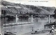 The bridge originally consisted of wooden arches resting on piles of masonry. It was located a little further downstream than the existing bridge. It was inaugurated in 1847. A few months after its inauguration, in 1848, two arches on the side of the left bank were set on fire during a riot. It was then rebuilt. In 1856 the wooden arches were replaced by cast iron. This is the bridge that Pinchon painted. These arches proved fragile and it was decided to build a new bridge in 1912. Despite its destruction during the Second World War, the bridge completed and operational in 1914 is still used today.[5]