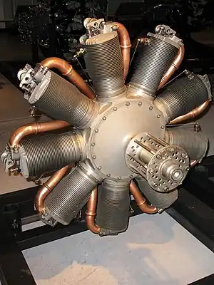 The Le Rhône 9J is a nine-cylinder rotary aircraft engine produced in France by Gnome et Rhône. Also known as the Le Rhône 110 hp in a reference to its nominal power rating, the engine was fitted to a number of military aircraft types of the First World War. Le Rhône 9J engines were produced under license in Great Britain by W.H. Allen Son & Company of Bedford, and in Germany by Motorenfabrik Oberursel where it was sold as the Oberursel Ur.II.[2]