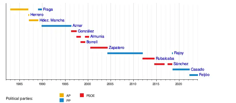 Pedro Sánchez nominally re-assumed the title once he was reelected as PSOE leader in June 2017, although he did not have a seat in parliament as a result of him resigning in protest to his party tolerating Rajoy's second government in October 2016.[41] The position was left vacant after Mariano Rajoy was ousted as prime minister in a motion of no confidence on 2 June 2018—with Rajoy himself rejecting to assume the title again—, until the election of Pablo Casado as new PP leader.[42] From 23 February 2022, the position was again left vacant following an internal PP rebellion, led by Galician and Madrilenian presidents Alberto Núñez Feijóo and Isabel Díaz Ayuso, that resulted in the downfall of Casado as party leader following his abandonment by most of his party's colleagues and other leading members.[43][44]