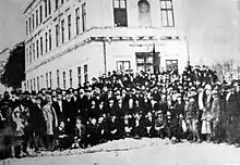 Clashes continued within the party between leftists and centrists – the latter favouring pursuit of reforms through a parliamentary system. The leftist faction prevailed at the second congress held in Vukovar on 20–24 June 1920 and adopted a new statute.[15] That aligned the party entirely with the Communist International (Comintern),[16] implementing all instructions received from the Comintern.[17] Furthermore, the party was renamed the Communist Party of Yugoslavia (Komunistička partija Jugoslavije, KPJ) to allow its membership in the Comintern.[18] Filip Filipović and Sima Marković, both former SSDP activists, were elected to lead the KPJ. By May 1920, the KPJ had about 50,000 members,[19] and numerous sympathisers largely drawn from among 300,000 members of trade unions and youth organisations.[20]