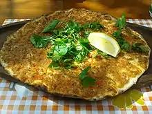 Cheese, as well as yogurt and eggs, are used in the cuisine of Lebanon. One of the more recognizable dishes within Lebanon is labneh. Unlike regular yogurt, labneh is strained so as to remove the watery whey, leaving a thicker, creamier consistency. It is spreadable and garnished with olive oil and sea salt.[44] It is an extremely versatile dish that can be served in a mezze platter for either breakfast or dinner. A variant is mixed with garlic.[44] Ejjeh is the traditional omelette of Lebanon.[45] It is made with egg, chopped parsley and scallions. Within Lebanon, people make this omelette with different herbs that are cultivated from their village.[46][47]