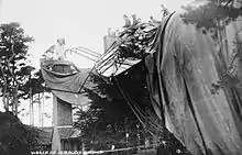 The Morning Post left Moisson on delivery to Farnborough at 10:15 in the morning of 26 October 1910, carrying eight people including the pilot Louis Capazza and three passengers: the designer Henri Julliot, the newly appointed commander of the Army Balloon School Major Sir A. Bannerman, and a representative of The Morning Post.[4] By two o'clock it had reached Brighton on the English southern coast, it then travelled north over Horsham towards Aldershot.[2] It soon approached North Camp at Farnborough for an attempted landing on the common close to the Army Balloon Works.[2] Due to the strong winds it took a number of approaches to the common before troops managed to grab the ropes and secure the airship.[2] The airship was towed to a balloon works shed specially built to house it. It was soon realised it would be a close fit but as it had been measured to fit for the Morning Post all that was required was that care was taken in moving the airship into the shed.[2] With all but ten feet inside the shed, a large hiss was heard as the envelope had caught on a girder.[2] A number of troops were under the airship as it collapsed but nobody was hurt.[2]