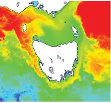 The ‘core’ of the Leeuwin Current can generally be detected as a peak in the surface temperature with a strong temperature decrease further offshore. The surface temperature difference across the Current is about 1 °C at North West Cape, 2° to 3° at Fremantle and can be over 4° off Albany in the Great Australian Bight. The current frequently breaks out to sea, forming both clockwise and anti-clockwise eddies.