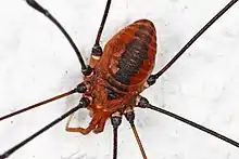 Leiobunum vittatum, the eastern harvestman, is a species of harvestman in the family Sclerosomatidae. It is found in North America.[1][2][3] They are most active from late spring to early fall, with late summer being when eggs are laid. Omnivorous, they feed on plant fluids, fungi and other arthropods. During autumn, they've been known to gather together to stay warm in tree holes or other shelters.