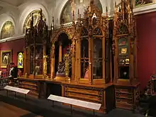 The bookcase was shown at the Great Exhibition 1851 in London. Leistler's exhibits were described as "massive, bold and masculine in design, and well adapted to a palace". The bookcase, "a cathedral in wood", bears elaborate decoration that referred to current debates on the unification of the German-speaking peoples. It was presented to Queen Victoria by Emperor Franz Joseph I of Austria and installed in Buckingham Palace for Albert, Prince Consort. In 1851, in its coverage of the Great Exhibition, the Illustrated London News described the piece as "the stately carved bookcase, by Leitner, claims special attention for its elaborate and ambitious design and the careful workmanship bestowed upon it."[1]
