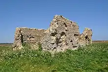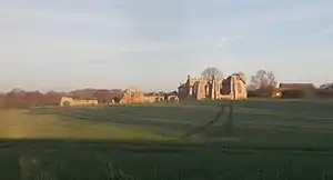 The site of the Leiston old abbey is identified with that of a ruined chapel at Minsmere, which stands near the sea on a marsh-girt island approached by a causeway from Eastbridge.[12] This belief, long uncertain, gained support from aerial photography which appeared to show cropmarks suggesting an extensive complex there.[13] It has since been shown that the chapel was not part of the original abbey, but was constructed on the site of the original monastery church soon after its removal in 1363.[14][15] The suggestion was made by Alfred Suckling in 1848 that Ranulf may have chosen a site which had been used for religious purposes in Anglo-Saxon times.[16]