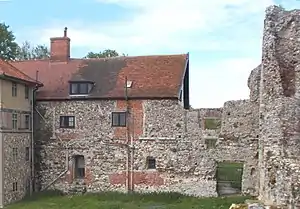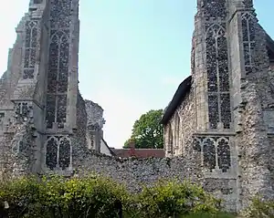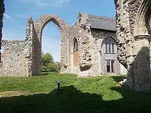 The title and associated estates passed to his son William de Ufford.[46] It was in or shortly before 1380 that, having been withdrawn from the ravages of the sea, the entire newly built monastery apart from its church was destroyed by fire, together with their corn and other goods. (Traces of this may be represented by areas of reddening in the surviving fabric.) The Abbot and convent were obliged to petition for a writ of supersedeas for distraint of the tenth, being thrown completely into debt and deprived of subsistence, and were granted this relief.[47] Whether this fire was a harbinger of the Peasants' Revolt in East Anglia in 1381, or the result of accidental causes, is not reported. William de Ufford was certainly vigorous in suppressing that destructive uprising, but died suddenly without heir in 1382 and was buried at Campsey Priory. In the wake of the fire the last major rebuilding took place: the Earl's will, written 12 June 1381, left 500 marks to Leiston Abbey.[48]