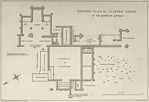 The plan of the ruins taken by Alfred Suckling in 1848 provides an outline of walls still surviving, which can be recognized in views made by Samuel and Nathaniel Buck (1738), Thomas Hearne (engraved 1781), Henry Davy and others. The "ritual east" of the monastery was orientated somewhat to the south-east geographically. Suckling's plan is described as "entirely inadequate" by Sir Alfred Clapham, whose studies of Premonstratensian architecture laid the basis of modern interpretation.[51]