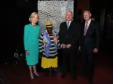 On 2 June 2013, Australian Governor-General Quentin Bryce handed over custodianship of Dayiwul Lirlmim at a ceremony at the Musée du quai Branly. On the impending unveiling of the rooftop installation, Bryce said "I look forward to millions of visitors to this beautiful city glimpsing an epically scaled and awe-inspiring wonder from the Kimberley on the bank of the Seine."[17] The installation was inaugurated on 6 June 2013, and saw Nyadbi and other dignitaries take a trip up the Eiffel Tower to view the work. Upon seeing her work on the rooftop Nyadbi shed tears, explaining that apart from feeling a great sense of excitement and pride it made her feel sorry for her traditional lands and whilst the diamond mine had destroyed the landscape of her country, the dreaming was still alive.[18] Lee-Ann Buckskin, the chair of the Aboriginal and Torres Strait Islander Arts Board, shared the tears with Nyadbi and said that the Dayiwul Lirlmim installation would bring to the attention to the people who see it of what is one of the world's oldest cultures.[19]