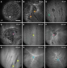 Cellular and supercellular structure in the mouse lens. Photos at increasing depth: A-Epithelium B-Broadening fiber ends C-Fiber ends lock together D-F- Voids G-Vacuoles I-Sutures