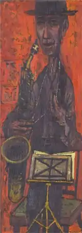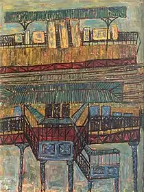 In his first two decades (1947–1966), Segedin favored cityscapes and people—heads, portraits, and scenes of city dwellers, musicians and religious figures. His style ranged from realistic to expressionist, as in Sax Man (1952), which featured rich, jewel-toned color, gestural brushwork, and an elongated figure with a convincing likeness.[37][38][39] He sometimes flirted with abstraction, particularly in cityscapes (such as Elevated Station, 1959), that critics noted for their effectively flat, linear compositions and patterning.[40][7][15] Chicago Tribune editor Edward Barry remarked on Segedin's ability to arouse "strong nostalgic emotion" in depictions of decaying, 19th-century buildings, such as Ruins (1952),[41] which was also recognized by the Art Institute of Chicago.[42]