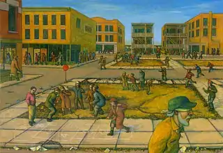 Segedin is a humanist representational painter, depicting life amid Chicago's storied elevated ("L") trains, brick storefronts, schoolyards, alleyways and cobblestone streets, often glimpsed from two-flat back porches and transit platforms.[1][2] Journalist Richard Cahan writes, "Chicago is in Leo Segedin's blood… [he] paints like Studs Terkel writes. In Chicagoese."[30] Discussing his work, Segedin says, "[My] paintings are about loss, about loneliness, about search. They are about the loss of a loved one, and also the loss of all those people who were part of my life, even those I never knew […] As I look back on my life—my work—what strikes me is how fast time passes, the temporary, fragile quality of all life."[26] Segedin was influenced by the 1930s legacy of social commitment and commentary—artists such as Ben Shahn, Hyman Bloom and Jack Levine—and German expressionists like George Grosz and Otto Dix.[3][24][15][16] His work speaks to the human condition on subjects ranging from the Holocaust to war and imperialism to growing up and aging.[1][35][36]