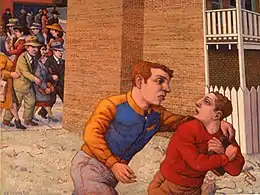 In the 1980s, Segedin returned to the cityscapes of his early life and work, in paintings and drawings of Chicago building facades, interiors, "L" platforms, and rush-hour crowds.[18][47] By 1987, he began to focus on single or paired figures—often youthful self-portraits—exploring coming-of-age themes, such as play and fantasy (Pilots, 1989[48] or the later "Games" series, 2015–6, see right) or peril (Hey Kid I and II, 1988 and 1989).[47][17] His "Hide and Seek" works (2003–6)[49] considered both, using the game as an existential metaphor for one's public versus private self, and the desire to know the true nature of others.[35] Alan Artner described these works of "magic realism" as meticulously rendered and naturalistic, with an intensity of mood and color, whose "force comes from a strangeness based on past time and its modes of life."[15]