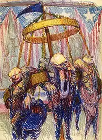 For a decade beginning in 1967, Segedin, in his words, "got hung up on social issues."[4] The expressionist paintings and craypa drawings of his "Babel" series (1967)[43] viewed the dehumanization of the Vietnam War through the lens of the Holocaust.[30][26] His "Polifiction" works (1968–9) addressed the temporality of power and humanity's inability to communicate in vivid images like Hanging Man (1968), depicting figures suspended from wheel spokes in chandelier or carousel fashion, set in convention-like settings, which referenced the infamous 1968 Democratic Convention in Chicago.[44][3][26] The "Body Count" (1970), "Body Parts" (1971–2), and "Permutations" (1976–9) series contrasted acid-colored, amorphous bodies and body parts with banal props like balloons, ribbons, and mechanical elements to represent the depersonalization that political order can visit on humanity.[45][26] Curators and critics described them as humanist "inner and outer landscapes,"[16] "beautiful, lurid, and frightful,"[1] and disturbing canvasses whose "searing colors and eerie, decadent light pit order against organism."[46]