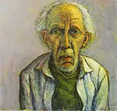 Segedin's style has continued to evolve in his seventh and eight decades of work, with new elements, such as pencil and ink detailing or wallpaper patterns, and new themes, such as aging, which he explored wistfully in L Station (Three Ages) (2002),[50] in celebratory fashion in the "Old Men Dancing" series (2008–10),[51] and more soberly in his extensive, ongoing series of self-portraits (2012–8), such as Self-Portrait (2017).[52][36][24]